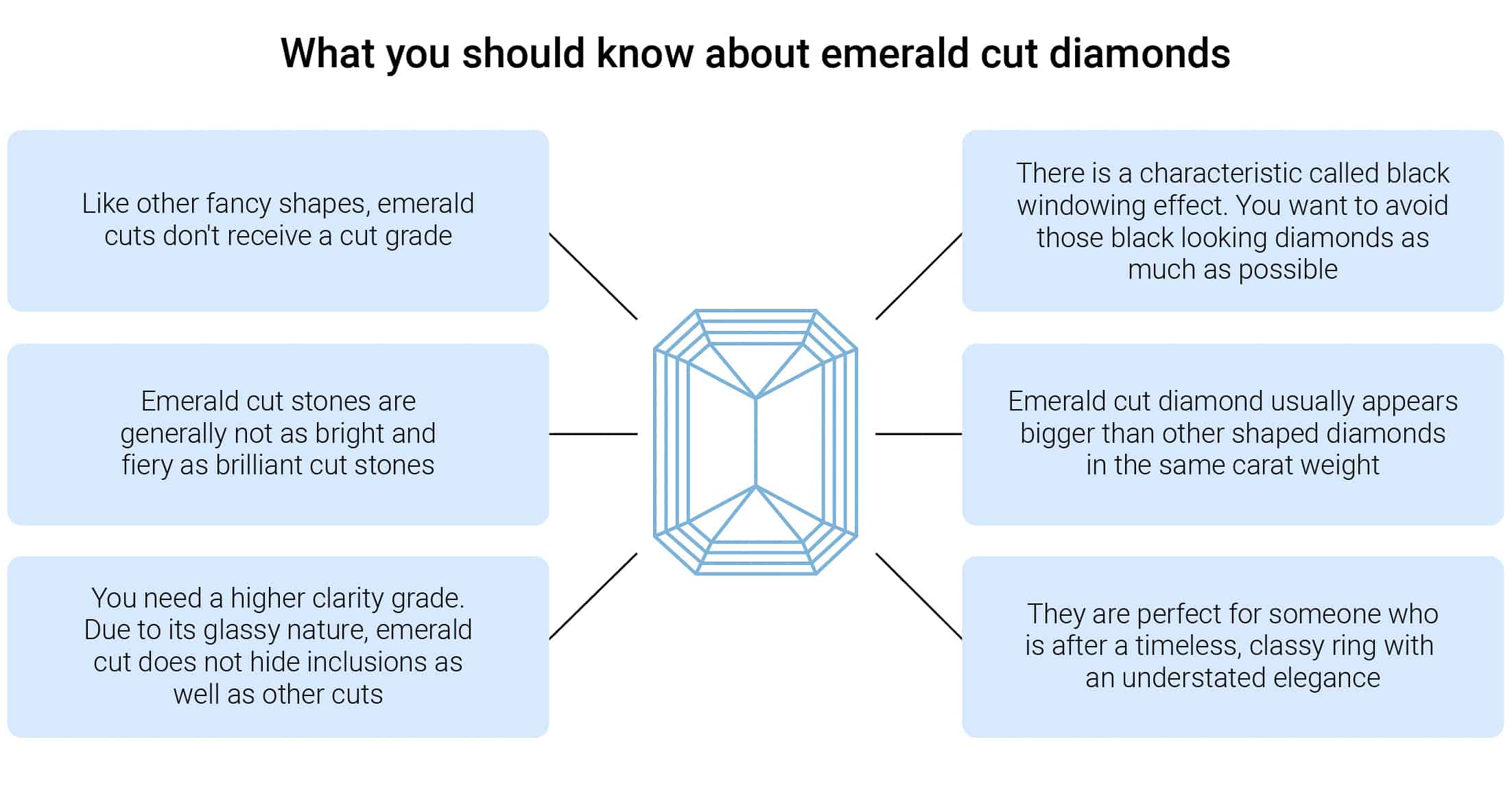 In other words, blemishes in an emerald cut diamond will be more noticeable than in a round cut diamond or cushion cut diamond.