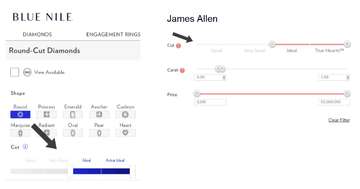 For example, on Blue Nile’s site for round diamonds, you should limit your selection to Ideal and Astor Ideal diamonds. On James Allen, choose Ideal and True Hearts cut.