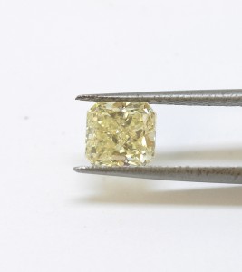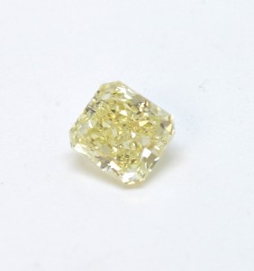 Take a look at this stone that Yossi found today in the bourse. It’s a real beauty at a great price. It’s fancy light yellow, so its stronger in color than an XYZ. It has strong fluorescence, but it doesn’t dull the color at all.