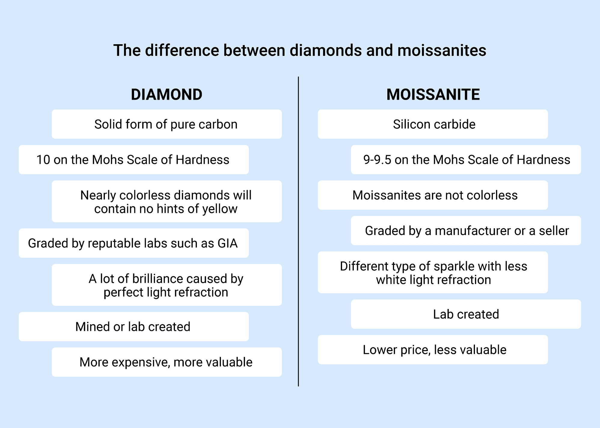 On the Mohs scale of hardness, a moissanite measures in at 9.25, while a diamond has a score of 10 — the maximum on the scale.