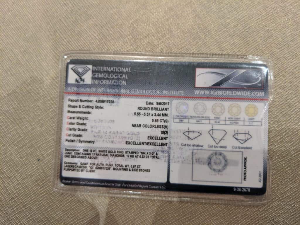 The ring came with an IGI certificate. The center diamond itself was a 0.65ct H SI2 (as graded by IGI). The diamond seemed well cut, and the grades were at least in the ballpark of what they should be. Overall the ring was not bad. The question is, was the ring worth the price?