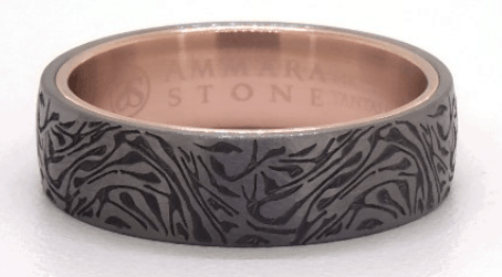The unconventional wood grain pattern of this ring suits a man whose tastes call for something masculine, sleek but more understated than some of the more classic precious metals used for jewelry.