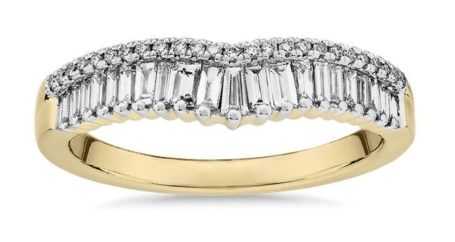 While an engagement ring like this pairs beautifully with a glittering diamond eternity ring, it’s also an excellent example of a ring that would be lovely with a simple, classic, matching metal band like this Yellow Gold 4mm Traditional Slightly Curved Wedding Ring. A chunkier band works perfectly to balance the weight and presence of a big, beautiful engagement ring without needing a lot of extra embellishment. The thicker band paired with a glorious radiant cut engagement ring is a totally current look without being too trendy to stand the test of time.