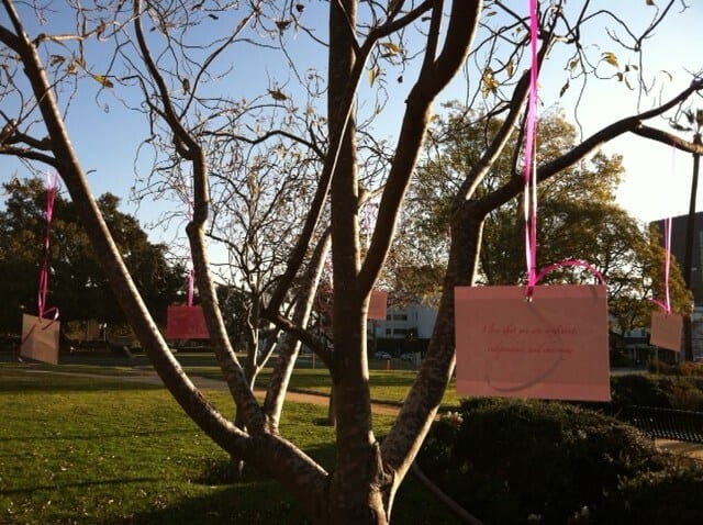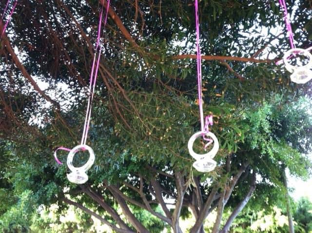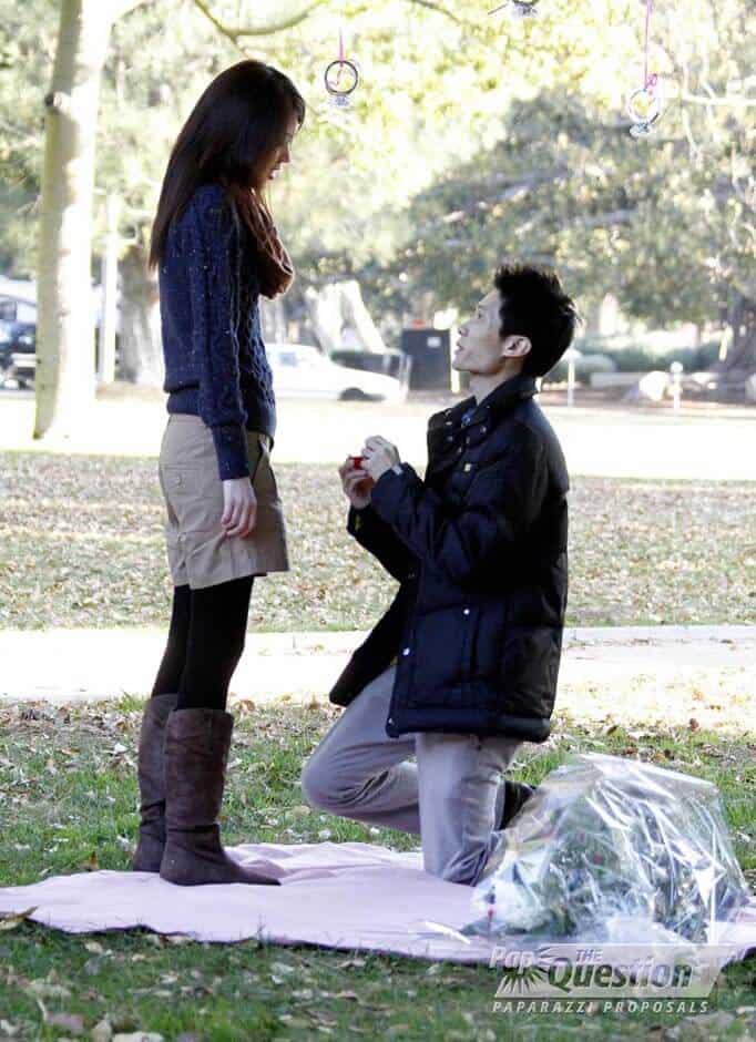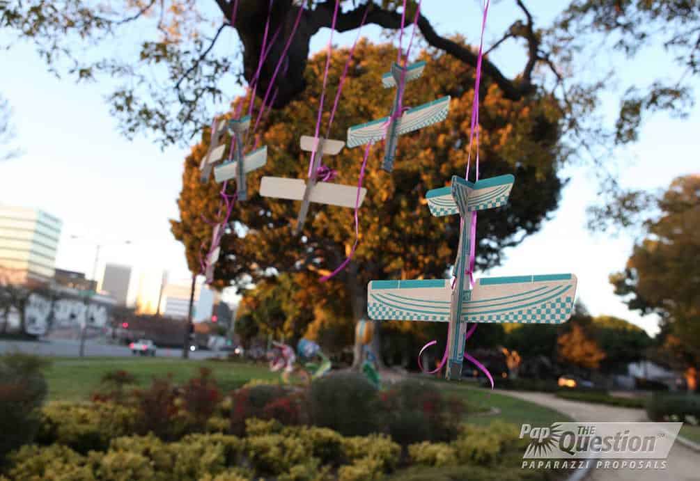 Years ago, Lim and his girlfriend were separated by distance so he gave her a wooden airplane and said that if she ever wanted to see him he would always fly to see her. We built the proposal concept on that. When the couple went for an unassuming walk in a park, they came upon a tree that had similar wooden planes hanging from the branches. Lim stopped under the tree to talk about the time he gave her the plane years ago. They continued to walk and next they saw a tree with pictures from their relationship and love letters from Lim. The last tree had a violinist waiting for their arrival and she began playing the couples song. The branches were adorned with huge engagement rings and Lim took his girlfriend under the branches and proposed. They celebrated with “She Said Yes” cupcakes. Photo’s are courtesy of Pap the Question.