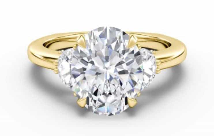 While some side stones can overwhelm the center stone, making it appear smaller by comparison, the shape and angle of the side stones on this Bella Vaughan Moon Three Stone Engagement Ring actually make the center diamond appear bigger. The overlapping diamonds have a seamless appearance, effectively creating the illusion of one, much larger diamond. This ring is available with a variety of different side stone shapes, and the center diamond can be round, oval or cushion cut, but we love the overall look and symmetry of an oval diamond with half moon side stones.