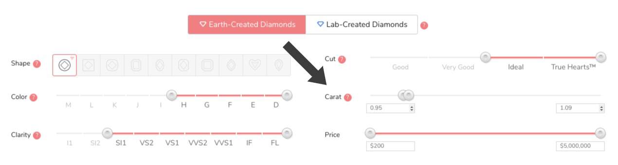 Choose the carat weight range you’re open to considering, such as a 0.95 to a 1.08ct diamond. As carat weight increases, so does the price.